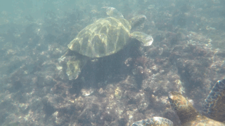 所以你会看到,海狮躺在栈桥上的椅子里,对坐在旁边的你毫不介意;当你坐得太近时,他会大喝一声,让你注意礼貌。海龟慢悠悠地煽动着双臂在水中飞翔,时不时抬头看看水面上费力游动的你,像是在思考这又是什么怪物。鲨鱼成群结队地从一个岩洞游往另一个岩洞,对你这个两脚兽见怪不怪。而海鬣蜥、军舰鸟和许多其他动物,大约只是在你挡路的时候嫌你比较麻烦罢了。