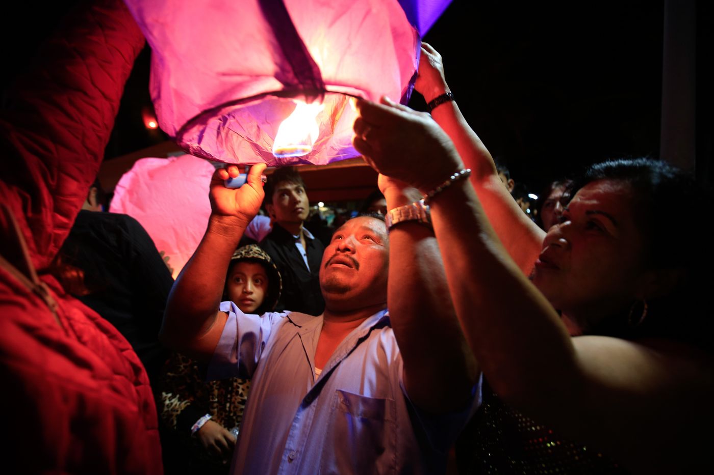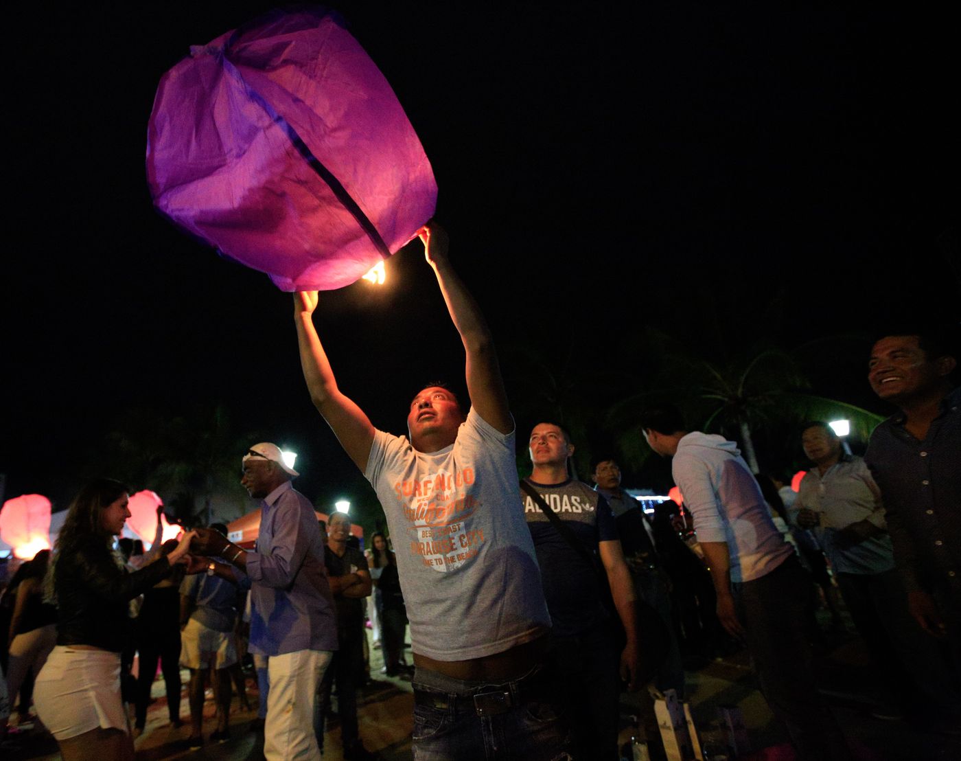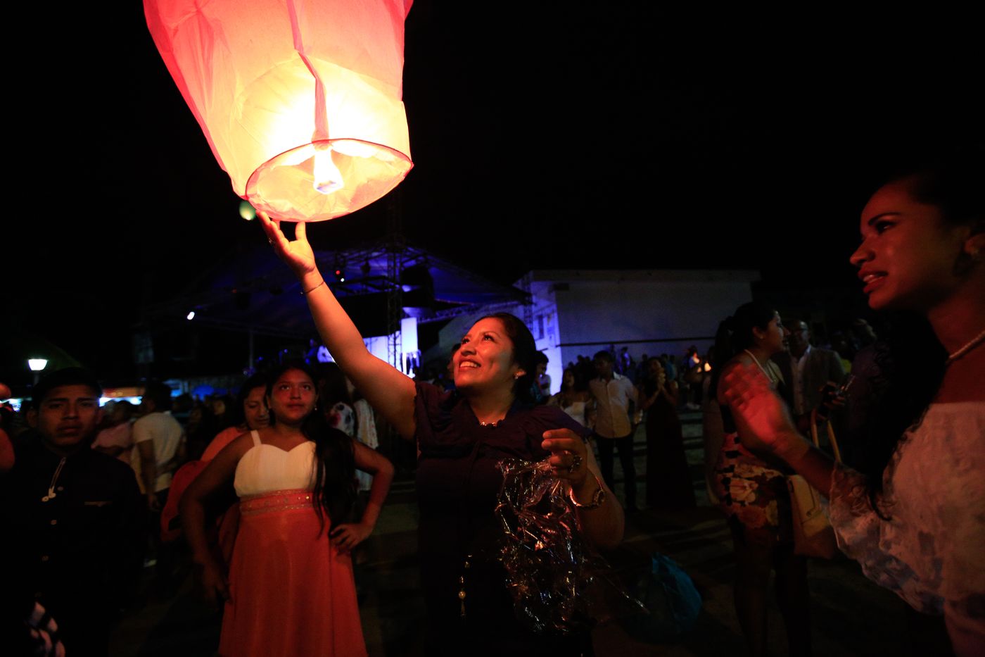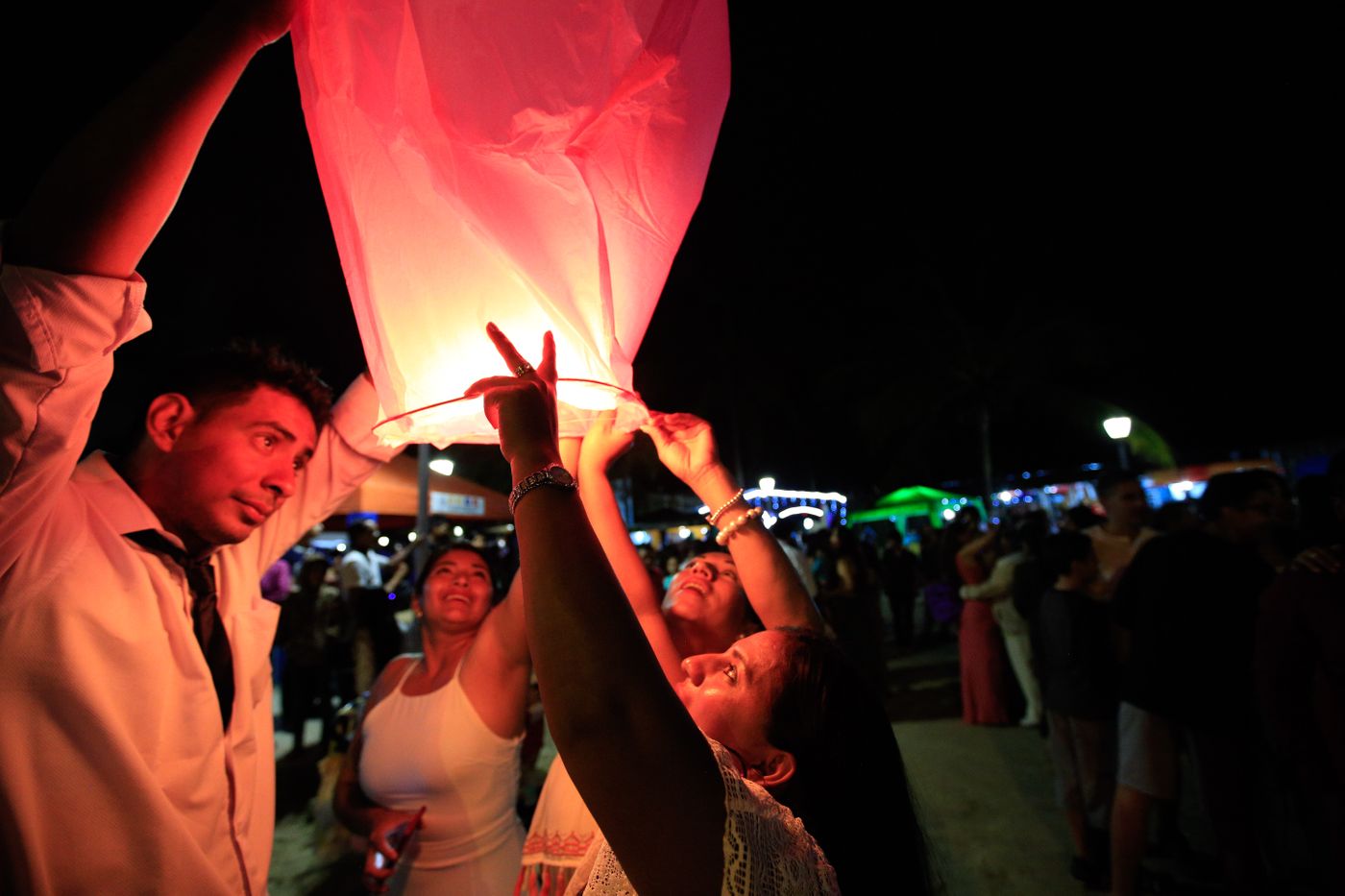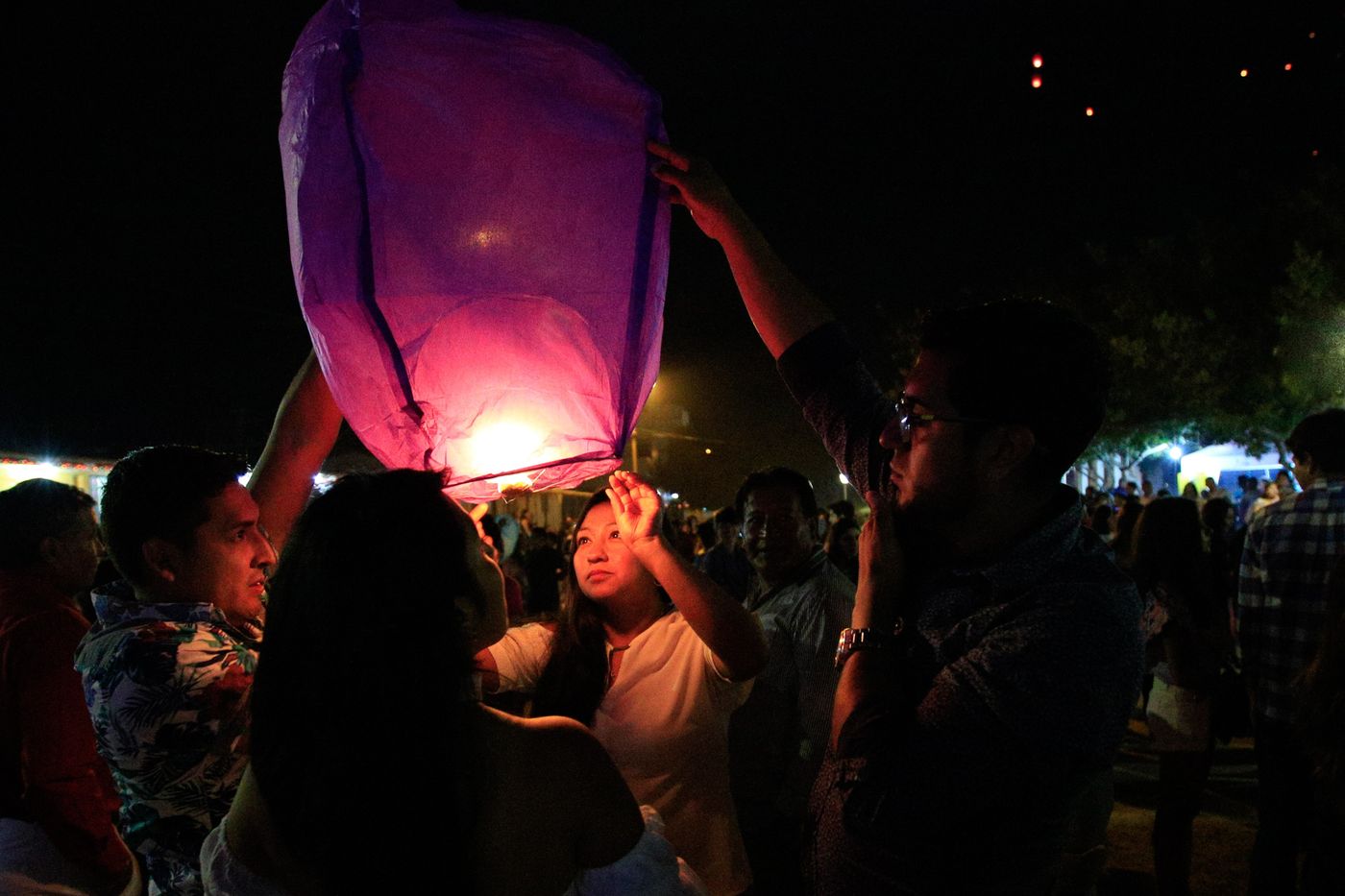 接近午夜时分,跳累了的人们慢慢安静下来,聚在一起,开始放飞一只只天灯。